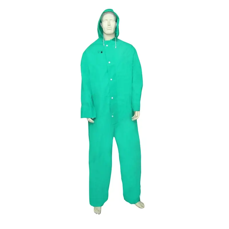 Anti-chemical protective coverall made from 0.45mm PVC/Nylon/PVC layered fabric provides full-body protection against hazardous chemicals, splashes, and contaminants. This industrial coverall features attached hood with drawstring, storm fly front with zipper, and elastic wrist closures for secure fit.