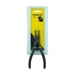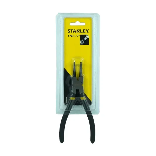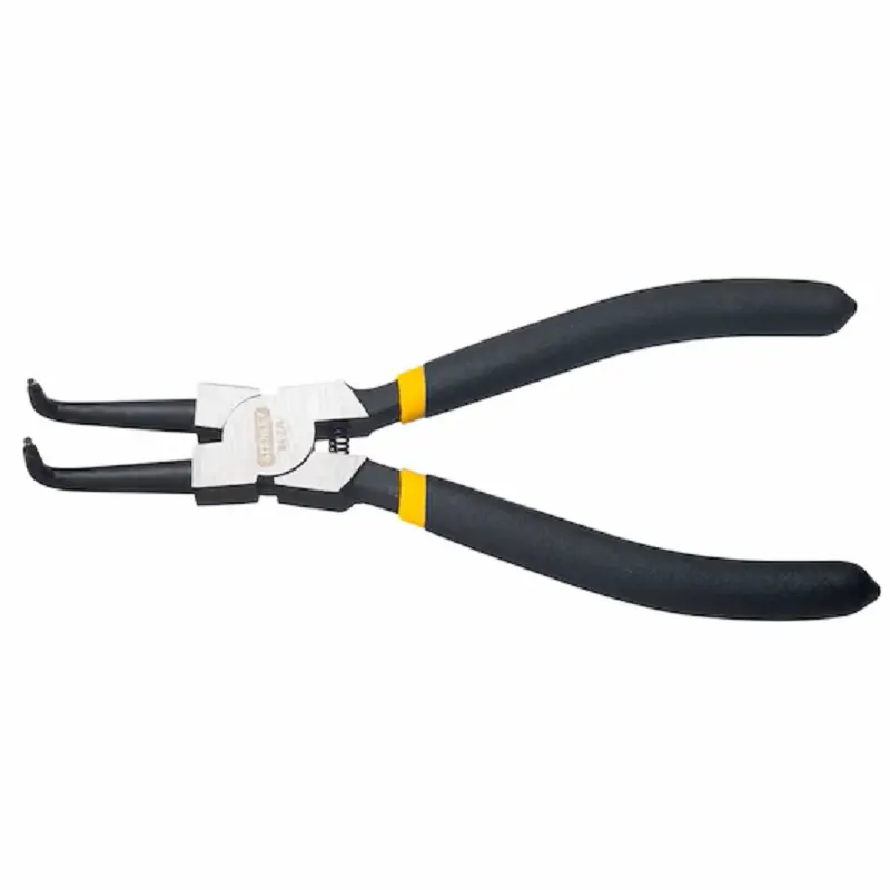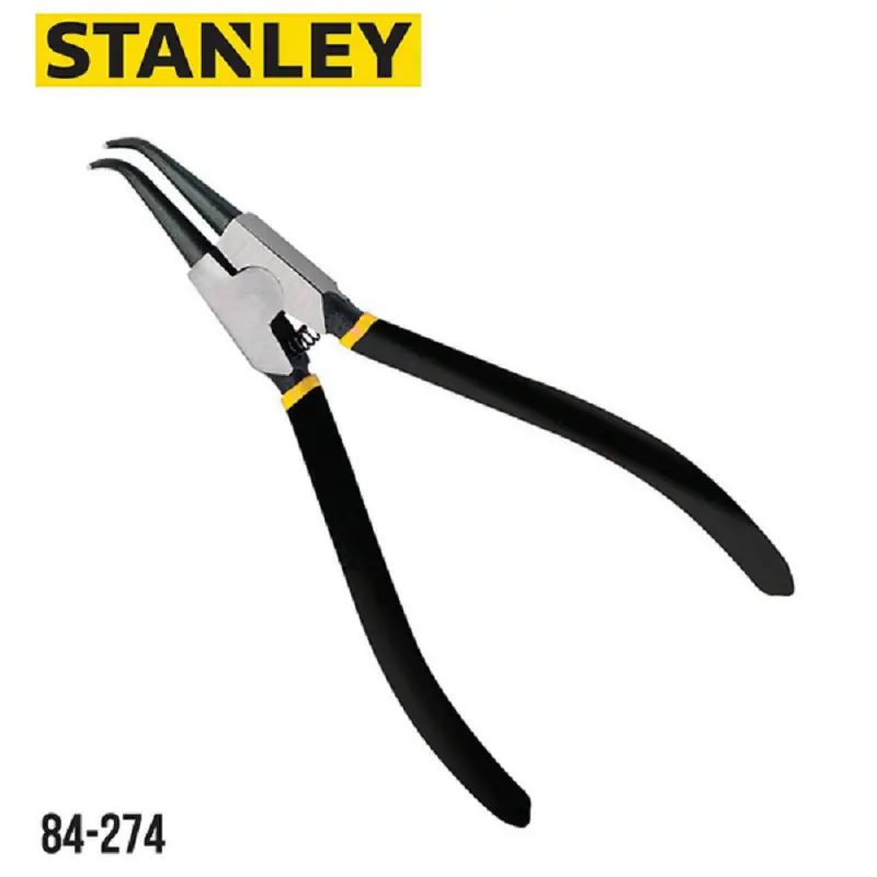 The STHT84274-8 Bent Exterior Type Basic Circlip Plier is a 7-inch tool designed for installing and removing circlips, especially in tight or angled positions. It is made from heat-treated carbon steel for strength and long service life. The bent tip design allows easier access to hard-to-reach areas, making it ideal for mechanical, automotive, and machinery maintenance. The plier features bi-material soft-grip handles for comfort and a spring-loaded mechanism that helps the tool open automatically, reducing hand fatigue during repeated use.