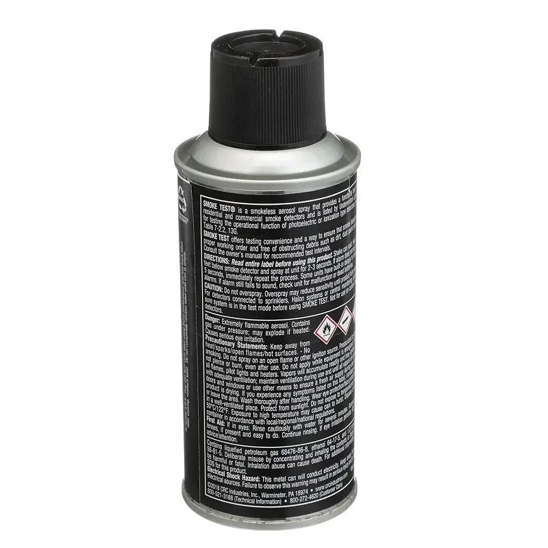 Aerosol smoke tester for quick and safe functional testing of smoke detectors without heat or residue.