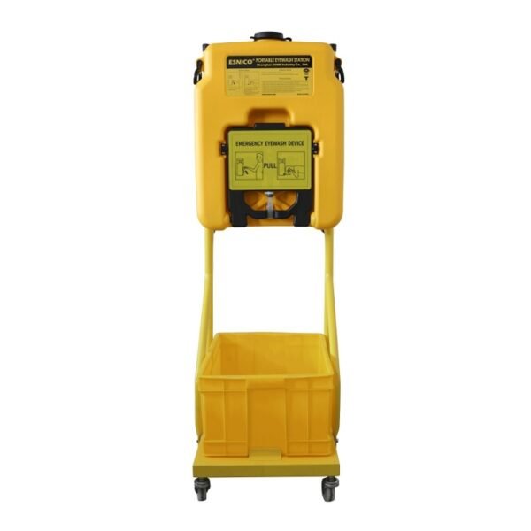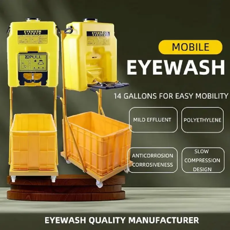 14-gallon mobile emergency eyewash station with wheeled trolley and self-contained tank, ideal for high-capacity eye safety in industrial environments.