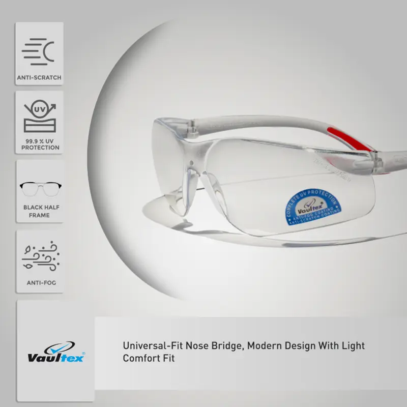 If you have been looking for spectacles that can block UV rays to the optimum and add to your style quotient, then safety spectacle from VAULTEX is what you want. You can shop from clear and dark lens options, whichever suits your requirements. The lens is anti-scratch and anti-fog, allowing you to easily wear it on cold winter days as well as with a face mask.