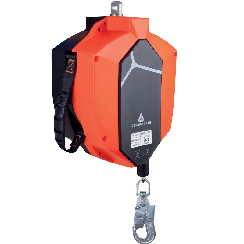 The PROTECTOR LARGE AN18020T is a heavy-duty self-retracting fall arrester designed for work at height where extended vertical movement is required. The galvanized steel cable retracts smoothly during normal movement and automatically locks in the event of a sudden fall to reduce fall distance and impact force. The unit includes an integrated energy absorber and fall indicator, and features a robust housing with a carrying handle for easier transport and installation. It is suitable for construction, industrial maintenance, storage facilities, and petrochemical environments.