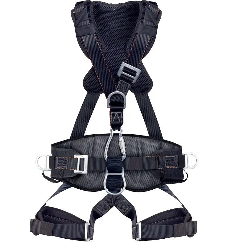 Comfortable full body safety harness with padded support, adjustable straps, and strong D-rings for secure and reliable work-at-height protection.