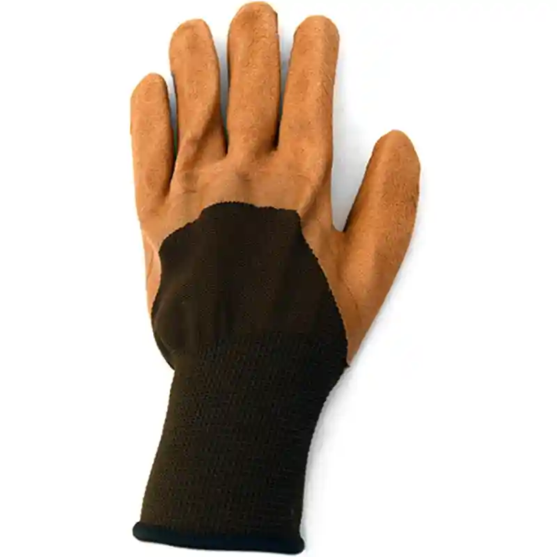 These heavy-duty work gloves are made of durable rubber with a coating on the palm and fingers for excellent protection against sharp edges and splinters. The knitted design at the wrist prevents dirt and debris from entering. These brown gloves come in a pack of 12 pairs, making them ideal for individual use or for equipping a work team. Suitable for gardening, construction, mechanics, and other demanding jobs.