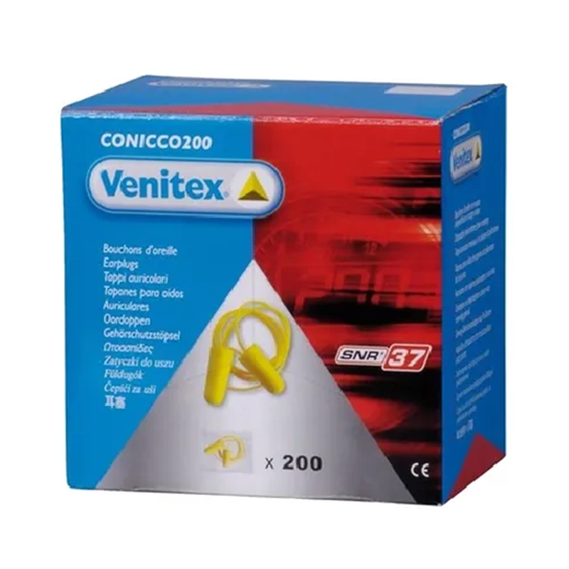 Dispenser box of 200 pairs disposable polyurethane earplugs with plastic cord. Individual plastic bag of 2 earplugs. Composition: Polyurethane foam. Product use – risk: Light…