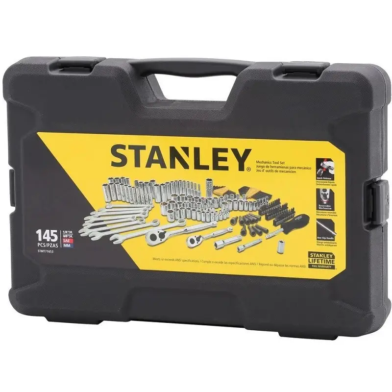 Complete STANLEY socket and tool set with durable carry case, ideal for automotive, workshop, and maintenance applications.
