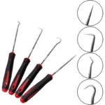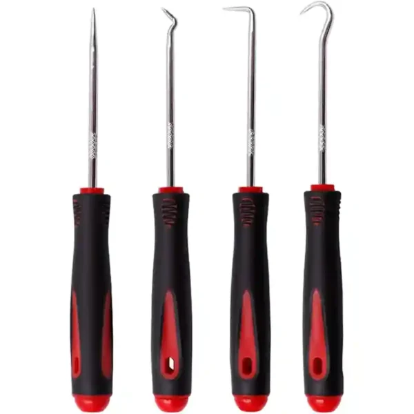 4-piece precision pick and hook set with hardened steel shafts and ergonomic handles, ideal for O-rings, oil seals, hoses, and small part removal in tight spaces.