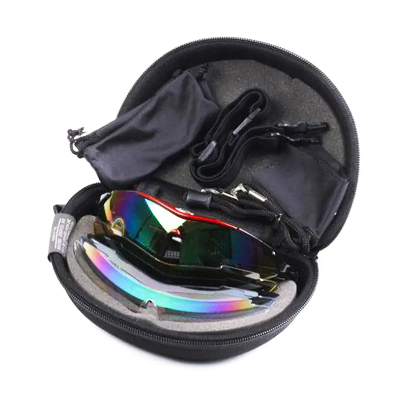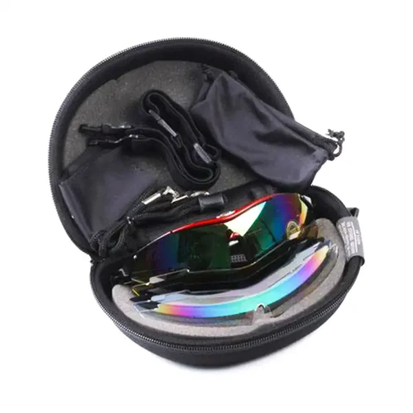 Professional work glasses provide high eye protection while performing tasks in industrial or outdoor environments. They feature impact- and scratch-resistant lenses with full UV protection, ensuring clear vision and complete safety while working. They come with a durable case and additional interchangeable lenses to suit different lighting conditions, as well as a mounting strap and a fabric pouch for easy storage and transport.