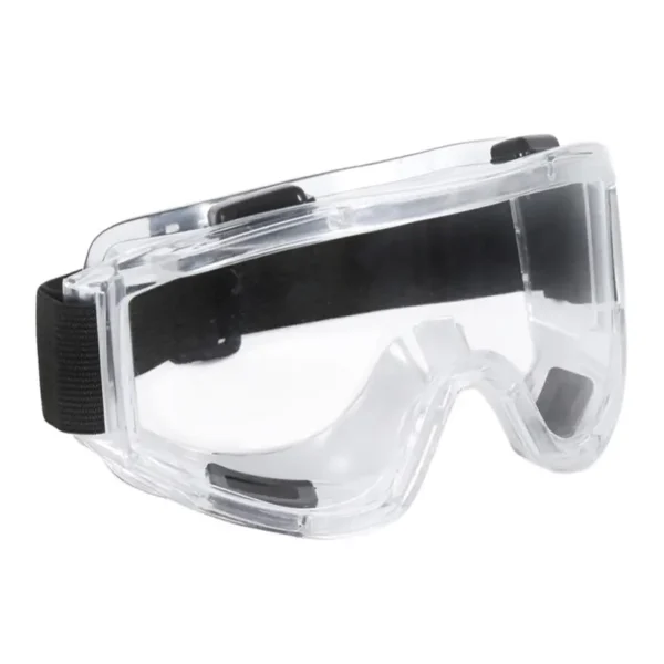 Durable safety goggles provide clear vision and protection from dust and sparks, ideal for industrial work environments.