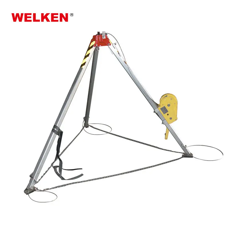 Lightweight aluminum confined space rescue tripod with winch, adjustable legs, and secure anchorage for safe lifting and rescue operations.
