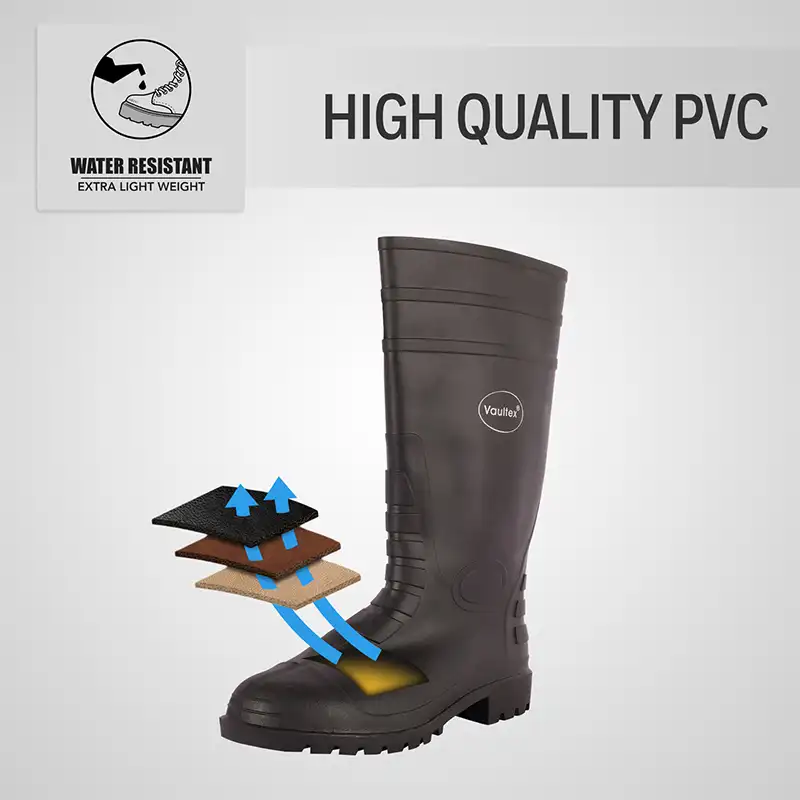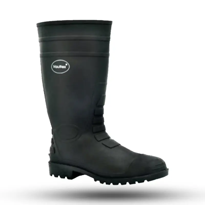 The RBT boots manufactured from Vaultex are Rain Boot with steel toe. These shoes are made with high-quality PVC by directly injecting in a fully automatic, PVC moulding machine. It is designed with a steel toe & energy absorbing heels for protection, comfort and durability. The oil-resistant feature will provide safety & prevent accidents on slippery surfaces
