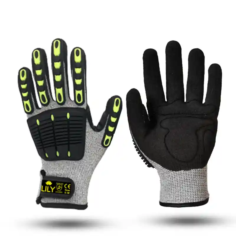 Impact- and cut-resistant gloves with 13G nylon/HPPE/fiberglass liner and sandy nitrile grip. Durable, protective, and comfortable for tough jobs.