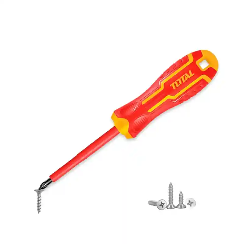 The Total 6-piece insulated screwdriver set is designed for safety and precision in electrical work. All screwdrivers in the set are insulated up to 1000 volts, providing complete protection during operation. The set includes slotted and Phillips screwdrivers in various sizes to suit different applications, making it ideal for electricians, technicians, and DIYers.