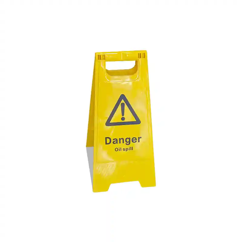 Foldable A-Frame safety sign with high-visibility yellow color and clear warning “Danger – Oil Spill” to alert people and prevent slip hazards in workplaces.