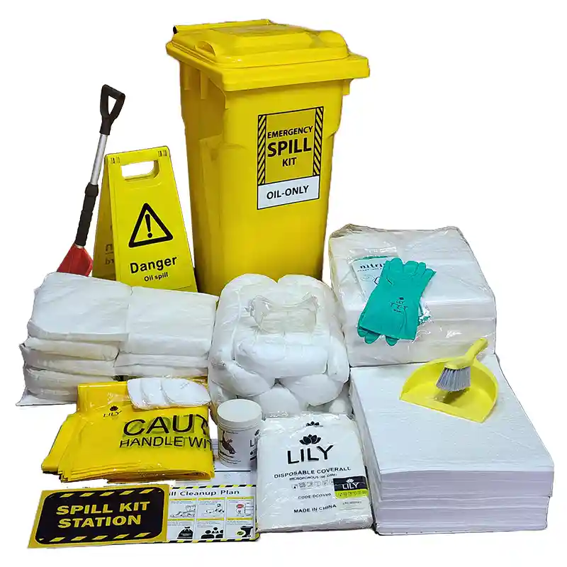 Mobile oil and fuel spill kit in a high-visibility yellow wheeled bin. Hydrophobic absorbents capture oil while repelling water for fast spill response in workshops, fuel stations, and outdoor areas.