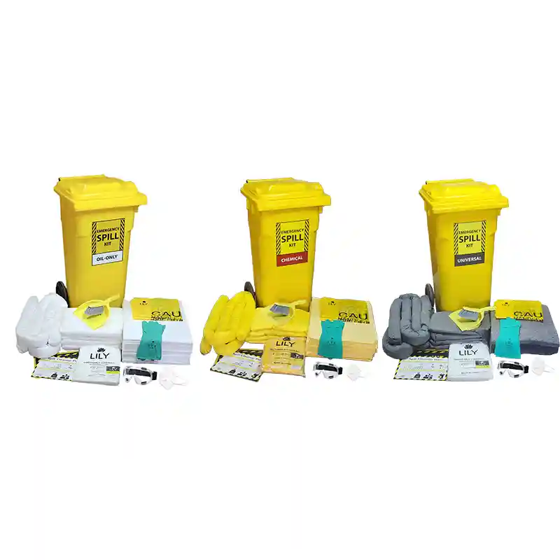 A Universal Wheeled Bin Spill Kit for everyday industrial spills. Absorbs water, oils, and non-aggressive chemicals, providing a mobile and reliable solution for warehouses, factories, and loading docks.