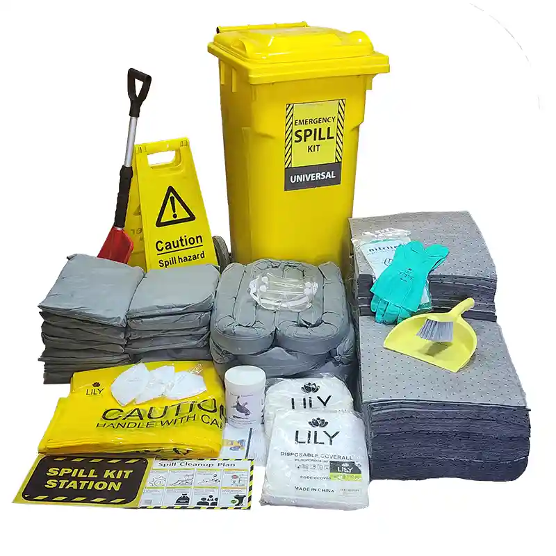 A Universal Wheeled Bin Spill Kit for everyday industrial spills. Absorbs water, oils, and non-aggressive chemicals, providing a mobile and reliable solution for warehouses, factories, and loading docks.