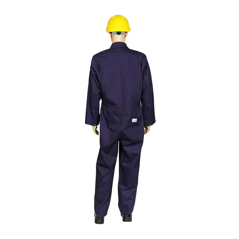 Protective coverall made from flame-resistant material to prevent burns and reduce fire risks in hazardous work environments.
