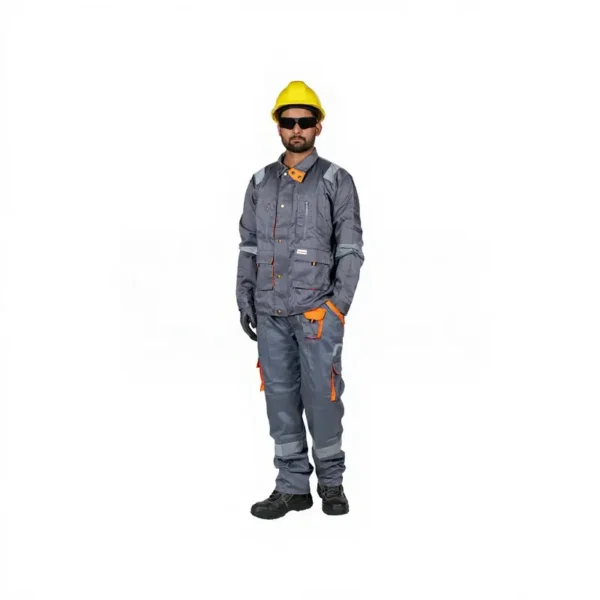 Durable grey twill workwear set (shirt + trousers) with reflective strips on sleeves, shoulders & legs, multiple pockets and reinforced stress‑points for high‑visibility industrial use