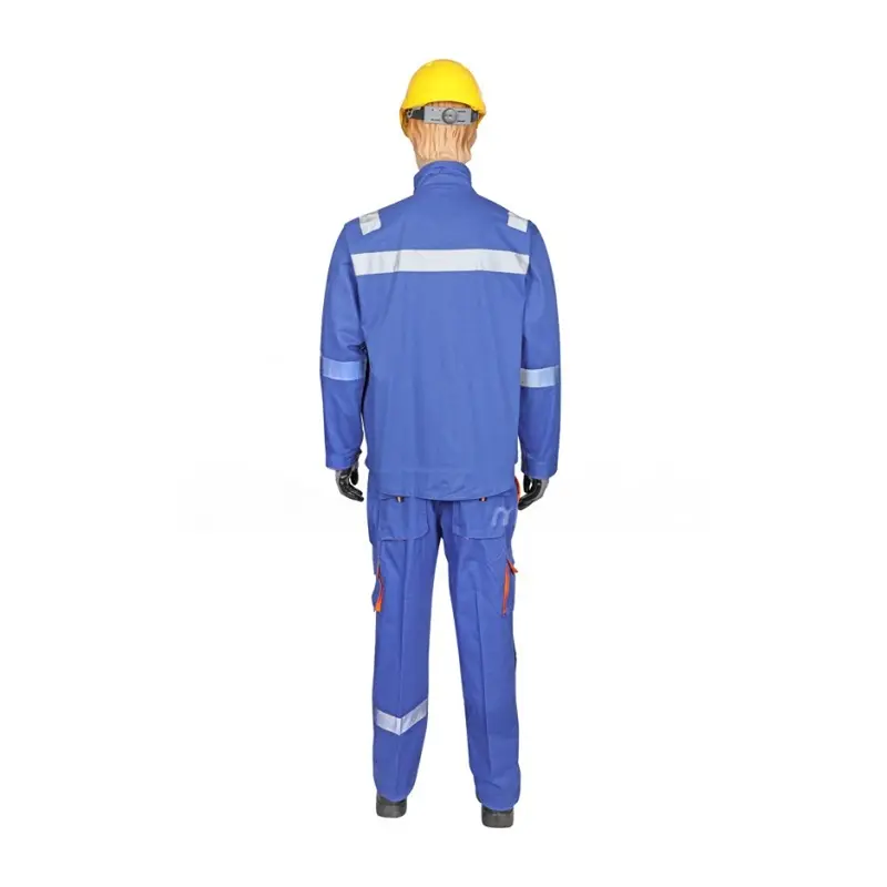 Vaultex blue industrial safety coverall with reflective strips, durable fabric, and multiple pockets—ideal for construction and industrial work.