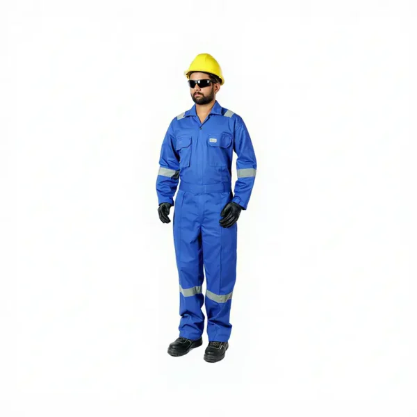 Durable cotton coverall with reflective strips, heavy-duty zip, and utility pockets for industrial safety